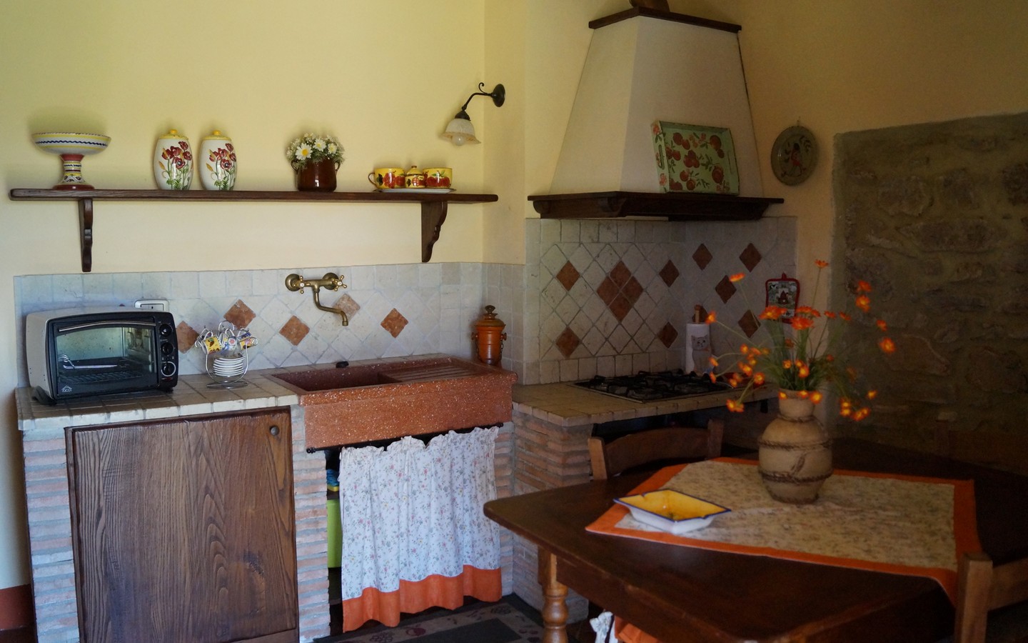 piano terra, è composto da cucina, bagno e camera matrimoniale con eventuale letto aggiunto. All'esterno è presente un portico con tavolo, sedie e barbecue